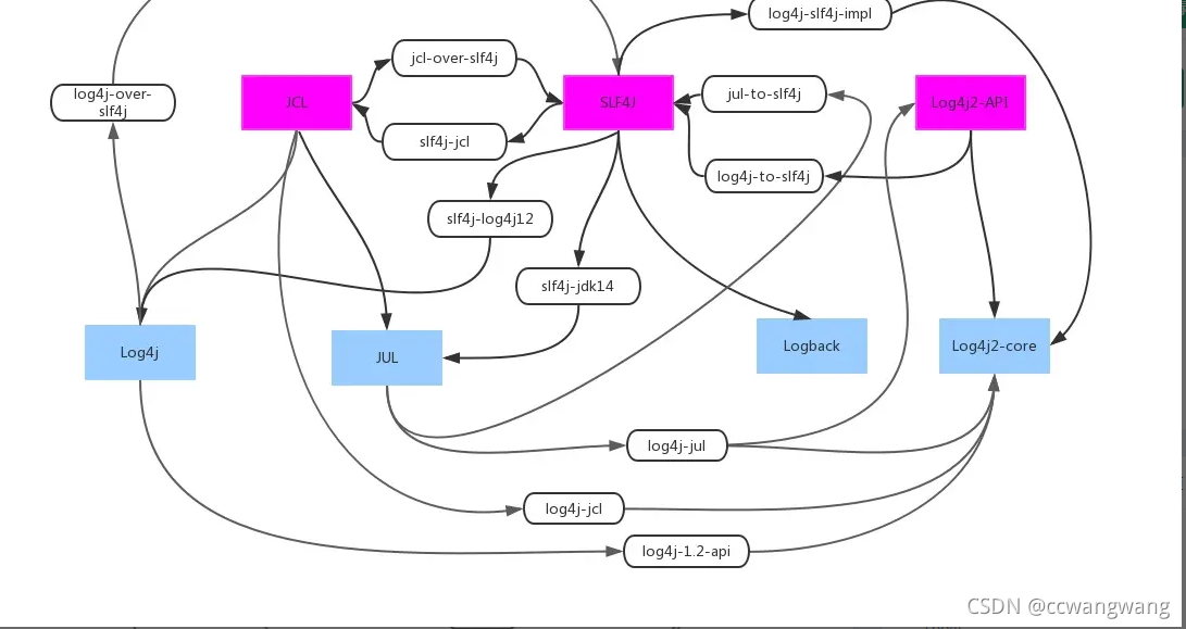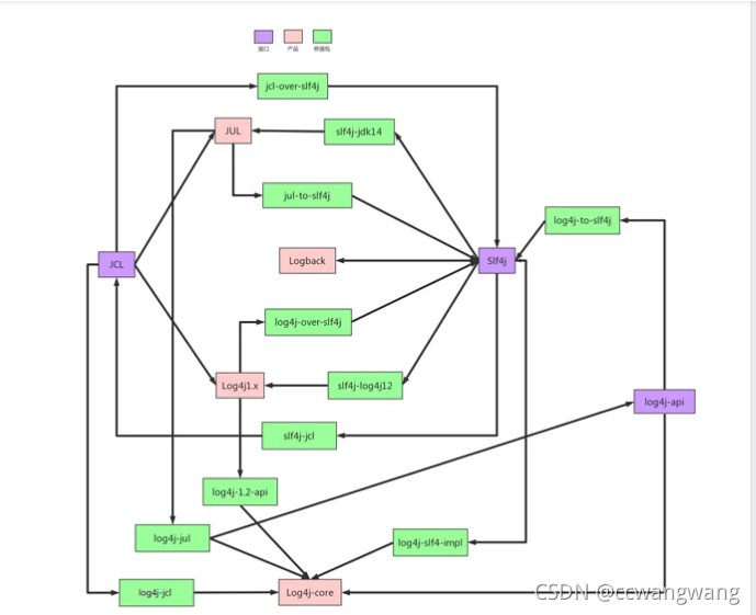 最早开始撸码当时就遇到几次日志jar包冲突的问题,当时也是很烦躁,毕竟了解的也不多,什么那里4j,这里4j,还有什么桥接包,而且在我感觉他们的包名都还差不多!!我当时是比较懵逼的,上网搜了下,随便看到一个类似这种桥接过去桥接过来的图我就懵,都是些啥玩意儿