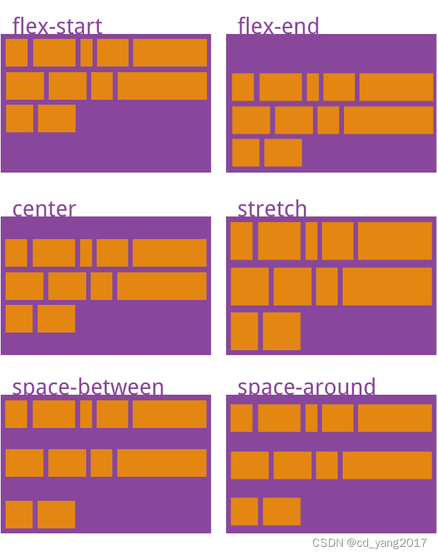 flex-start:交叉轴的起点对齐。flex-end:交叉轴的终点对齐。center:交叉轴的中点对齐。baseline: 项目的第一行文字的基线对齐。stretch(默认值):如果项目未设置高度或设为auto,将占满整个容器的高度。