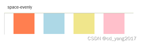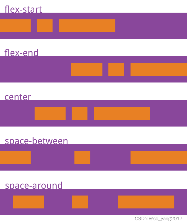 flex-start(默认值):左对齐flex-end:右对齐center:居中space-between:两端对齐,项目之间的间隔都相等。space-around:每个项目两侧的间隔相等。所以,项目之间的间隔比项目与边框的间隔大一倍。space-evenly:均匀排列每个元素,每个元素之间的间隔相等。