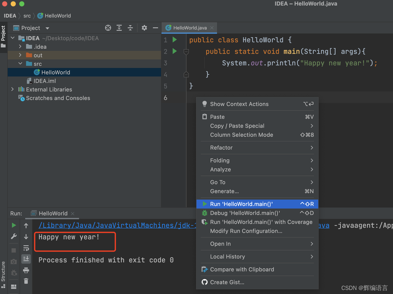 在类文件中编写代码,让程序输出你想要的内容,比如“Happy new year!”;点击右键》运行HelloWorld.main(),即可见内容