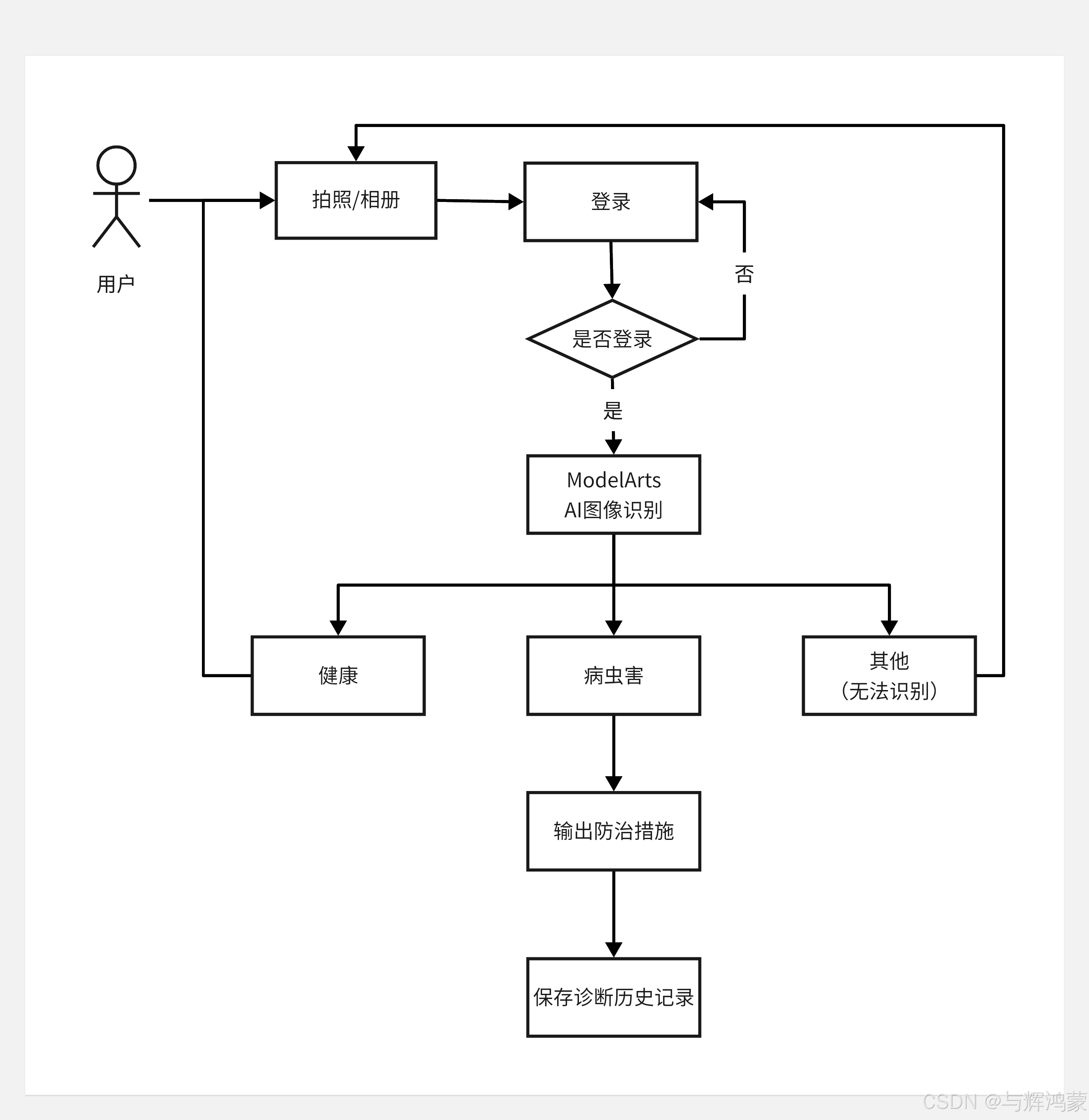 V1.0版本功能极其简单,核心功能只有“AI诊断分析”,用户路径是:注册/登录->手机拍照或从相册选取->调用AI图像识别能力诊断分析图片->ModelArts AI在线服务返回结果->APP展示病虫害结果->保存我的诊断记录。