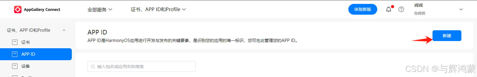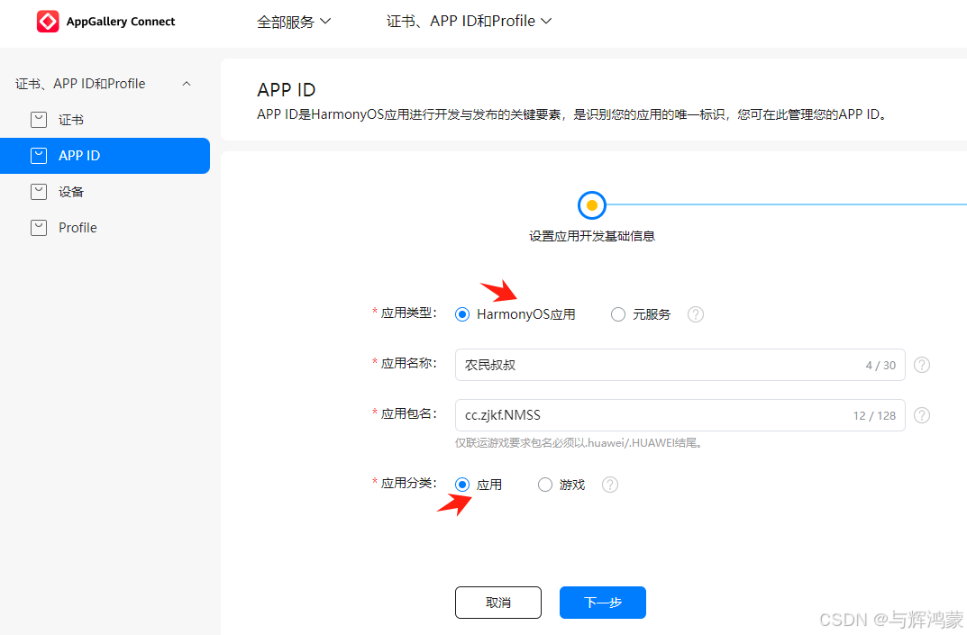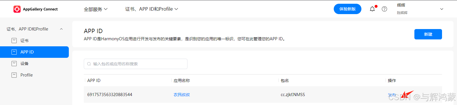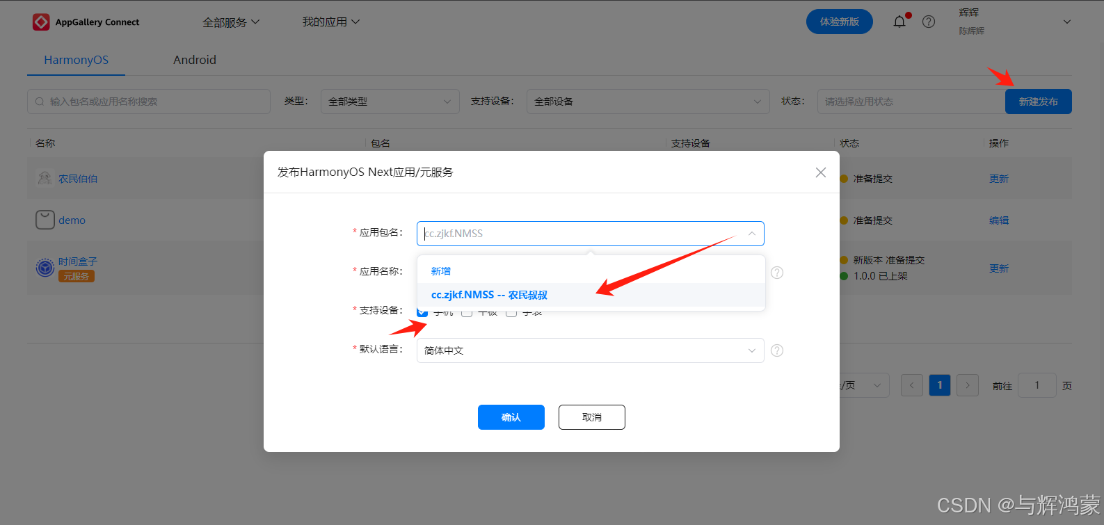 或在“我的应用”中新建发布,选取新建的APP ID,支持设备选“手机”。