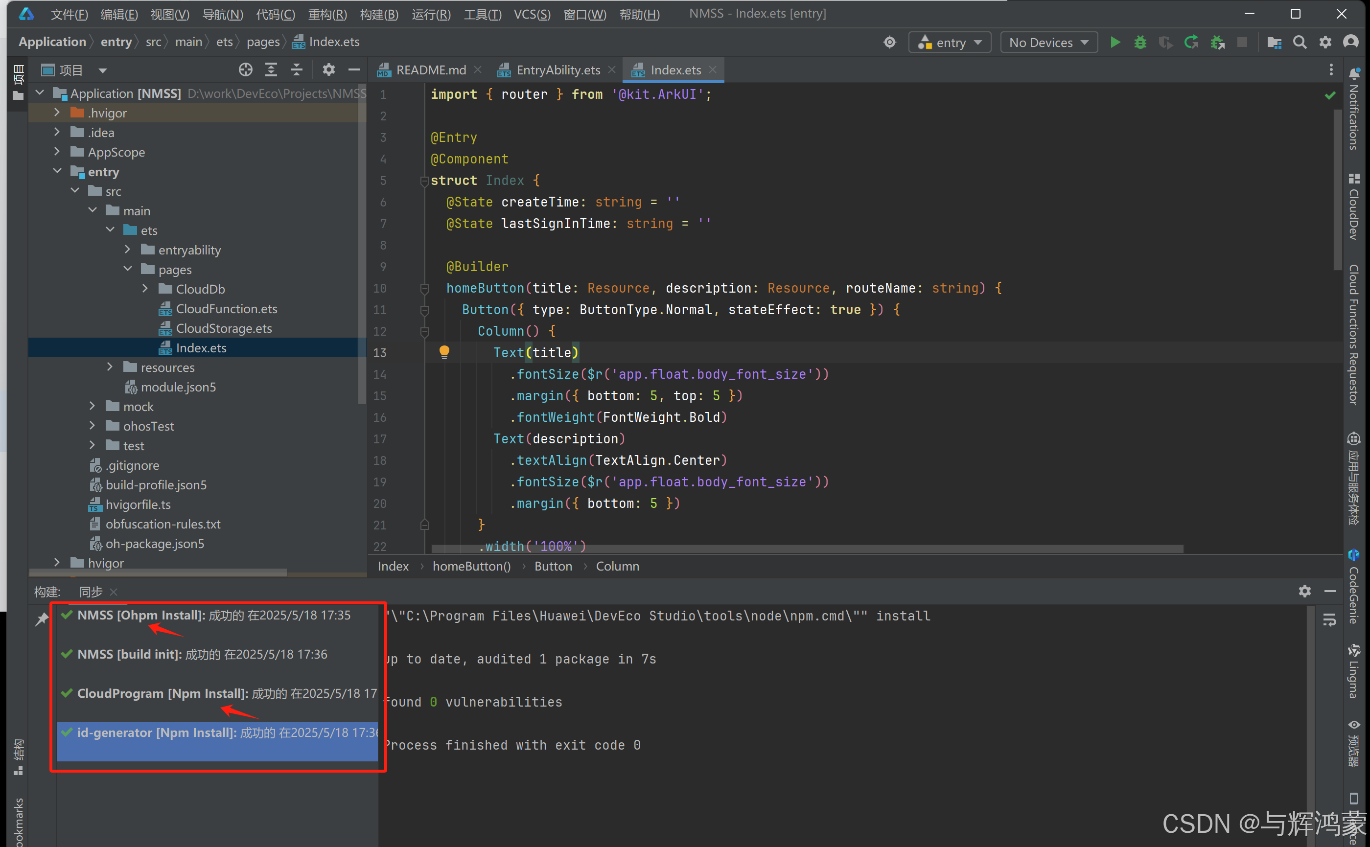 进入主开发界面,可见刚刚新建的工程。端侧工程会自动执行“ohpm install”,云侧工程会自动执行“npm install”,以分别下载端侧和云侧依赖。