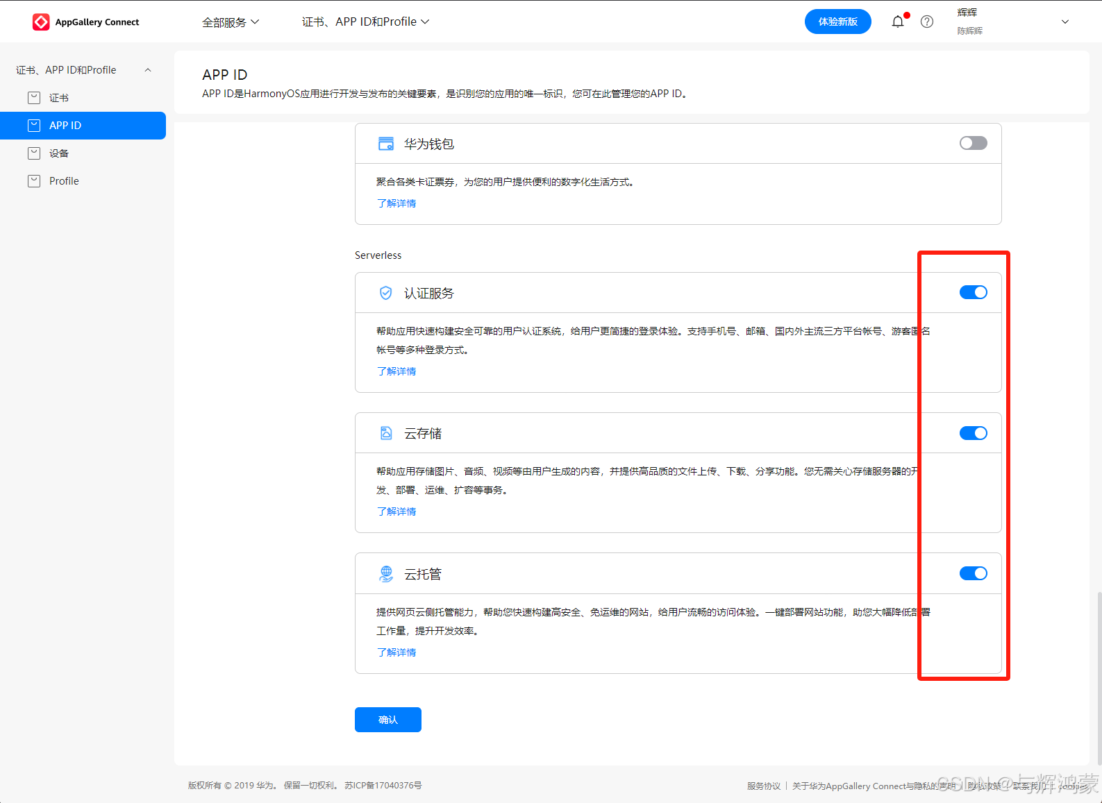 3.关联所属项目,并打开我们将使用到的开放能力“认证服务”、“云存储”和“云托管”。