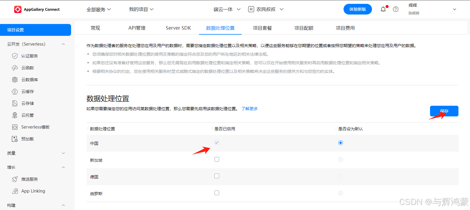 该应用尚未启用数据处理位置,点击跳转到AGC,管理设置默认中国站点,后续开发的云服务资源都将部署在中国站点。
