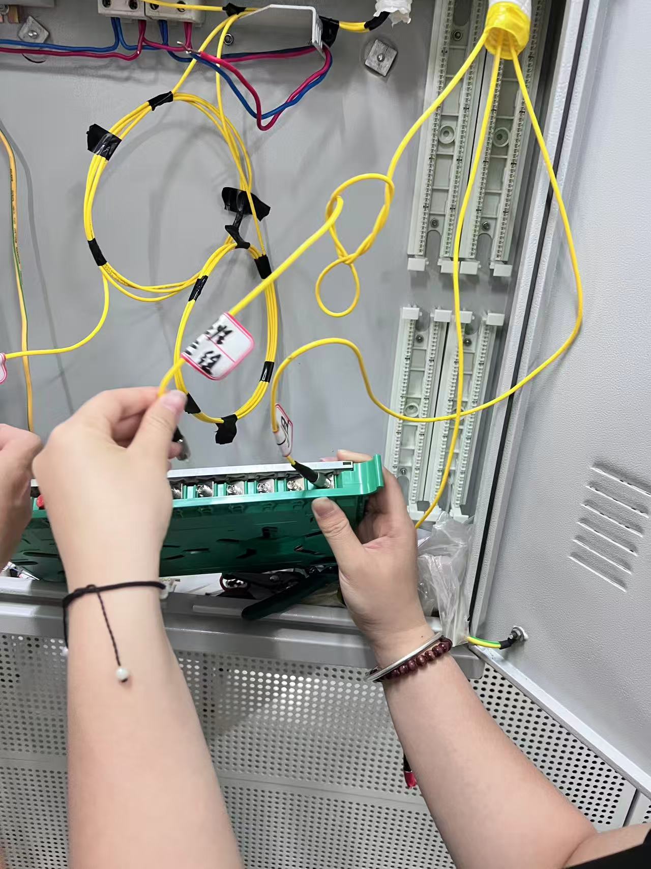 当亲手进行设备内部线缆连接(如图中在电气柜内接线 )时,我对 “失之毫厘,谬以千里” 有了切身体会。每一根线缆的连接都像是通信系统中的微小拼图,只有精准对接,才能拼凑出完整、流畅的通信画面。不同颜色和规格的线缆,承载着不同类型的信号或电力传输任务。错误的连接,哪怕只是一个端子的错位,都可能引发信号衰减、串扰甚至设备故障。这要求我们在操作时必须全神贯注,严格按照设计图纸和操作规范,做好每一个细节,确保每一次插拔、每一次拧紧都准确无误。