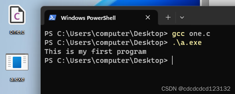 我们进到cmd中,使用 gcc one.c,我们的编译器会编译出来一个a.exe,我们在命令行中执行这个程序就执行了我们的第一个程序。