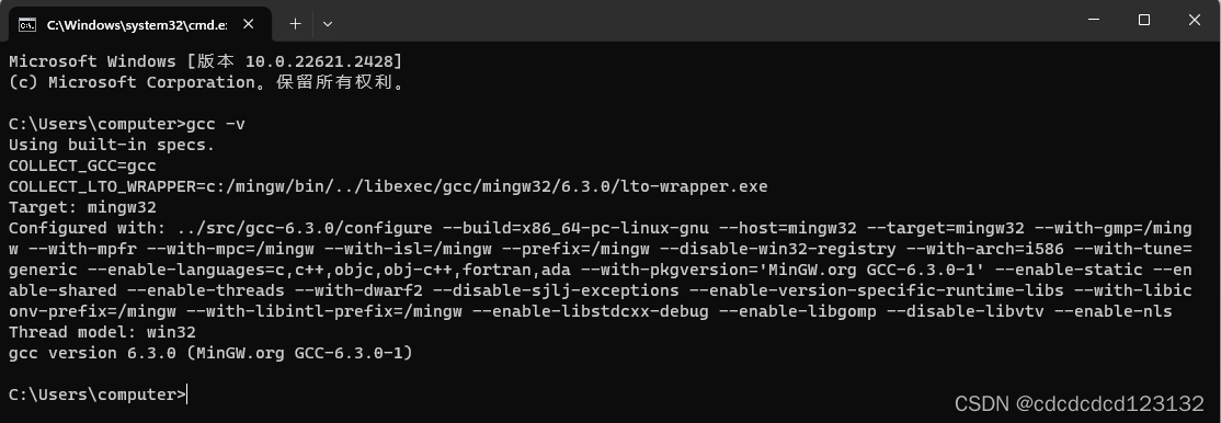 然后在cmd中输入gcc -v,出现版本信息则安装成功。