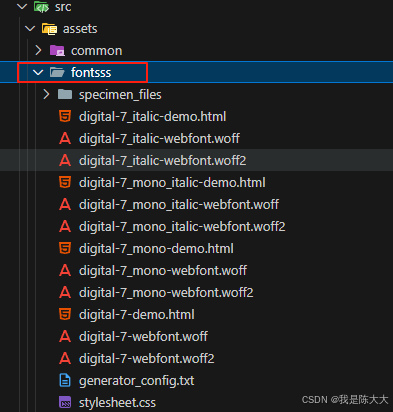 在Vue项目中的assets中新建fontsss文件夹,将解压后的字体文件在fontsss文件夹中