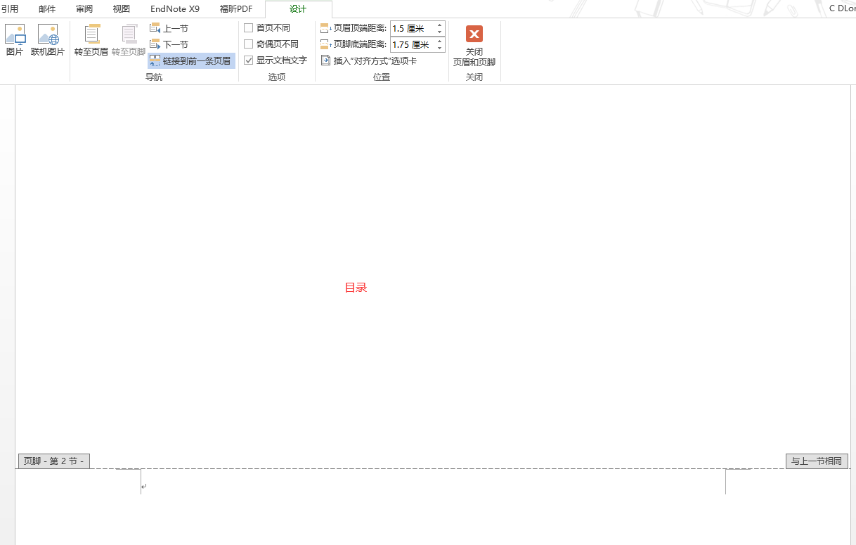 因为目录也不需要设置页码,所以我又点了一次「下一节」,这里的「链接到前一条页眉」可取消也可不取消,因为上一节是封面没有设置页码,因此即使链接也没关系: