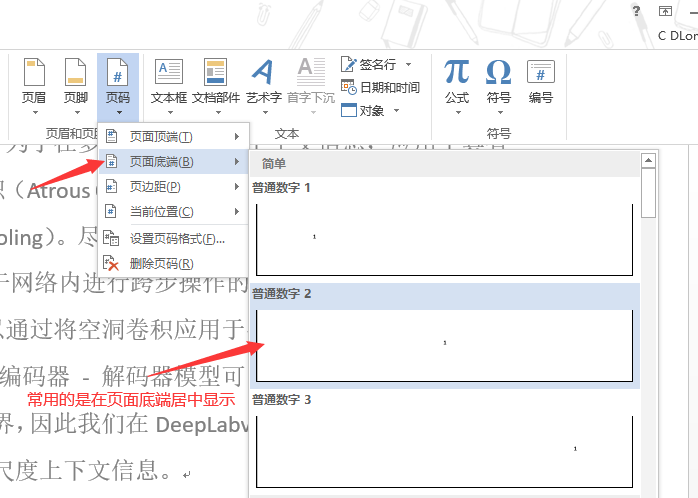 点击确定后,再点击「页码」插入一个合适的页码即可,我一般用的是「页面底端 -> 页码居中」的风格: