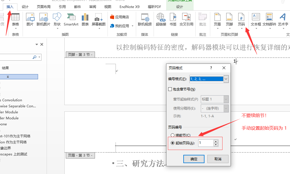 然后我们就可以点击「插入 -> 页码」设置页码格式,这里必须要选择「起始页码从 1 开始」,取消续前节: