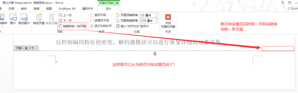 从目录节点击「下一节」到正文第一页,现在就是正文这一节了,我们从正文第一页开始设置页码,因为要把这一页作为第一页,所以要取消「链接到前一条页眉」: