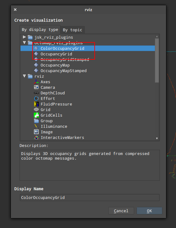 安装后启动 Rviz,直接添加一个八叉树占用网格的类型,第一个是带颜色的类型,第二个不带颜色: