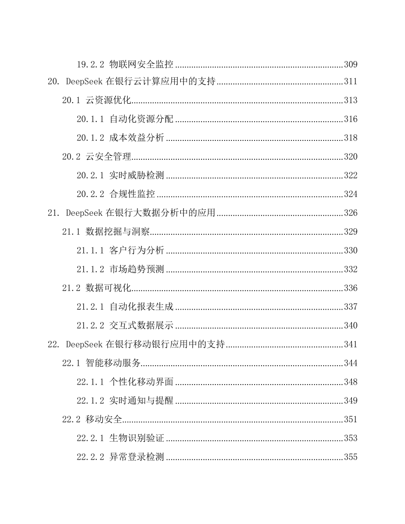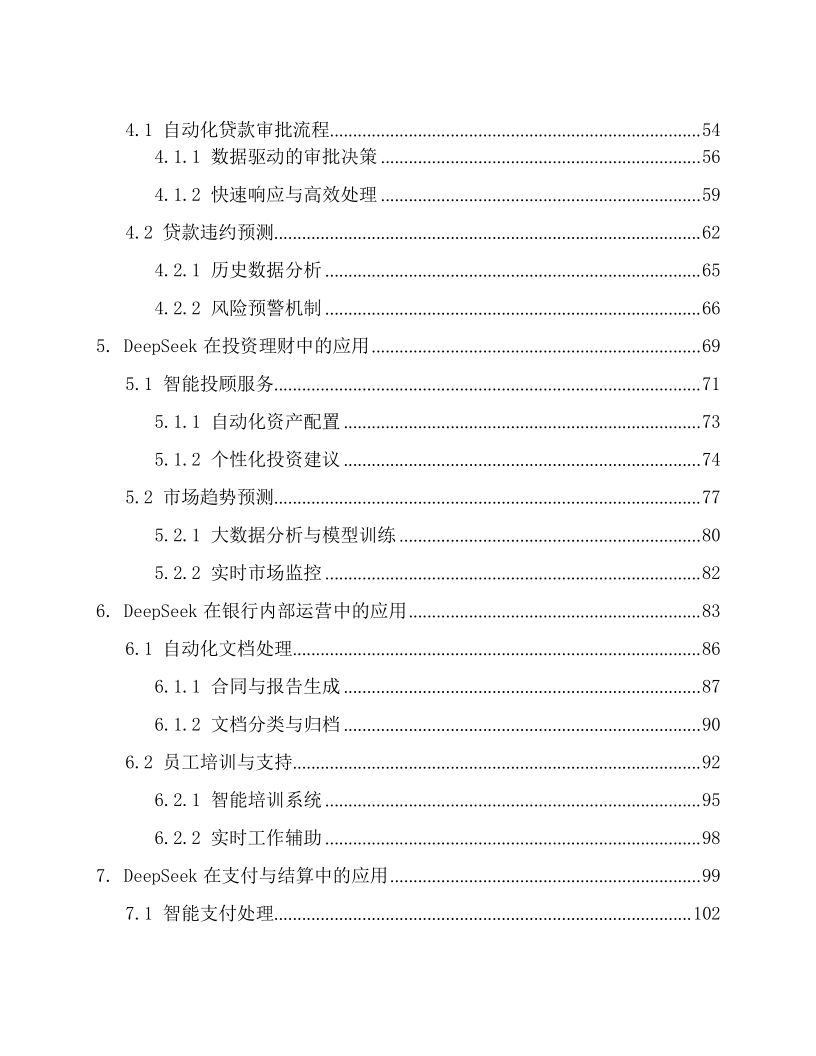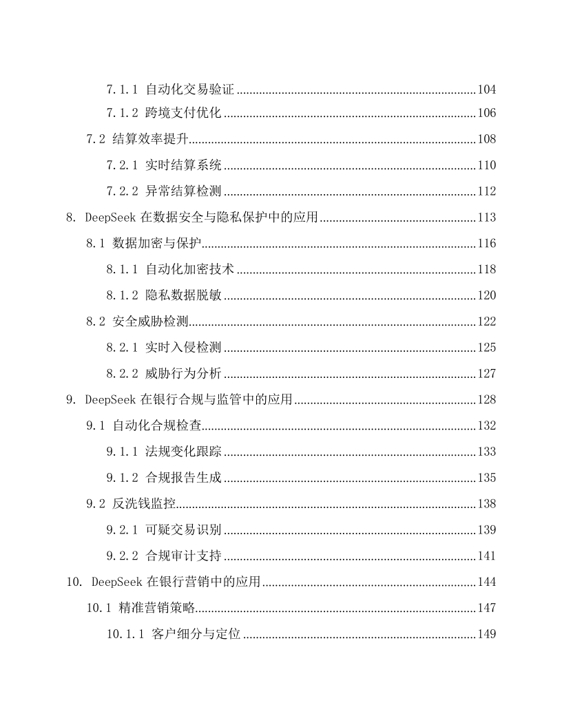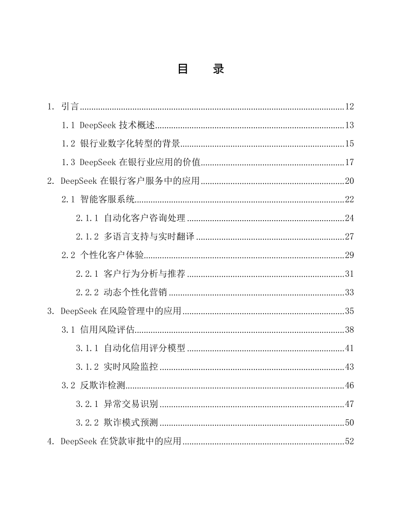 本文档为《DeepSeek 在银行的应用方案》,适配银行各业务部门(零售银行部、公司金融部、风险管理部等)的业务骨干与管理者、IT 部门(系统开发 / 运维岗)、合规与风控团队,以及金融科技企业(AI 金融解决方案研发团队)、银行咨询机构。核心围绕 DeepSeek AI 大模型在银行全场景的落地,以 “技术赋能 + 业务增效 + 合规保障” 为框架:先阐述技术优势(多模态处理、实时决策等)与银行业数字化转型需求;再覆盖 29 大核心场景,含客户服务(智能客服、个性化推荐)、风险管理(信用评估、反欺诈)、贷款审批(自动化流程、违约预测)、投资理财(智能投顾、市场预测),及内部运营、支付结算、数据安全等;还强调合规性(适配 GDPR、巴塞尔协议等)与技术支撑(隐私计算、区块链存证),结合实操案例与性能数据(如智能客服响应时间 < 1 秒、反欺诈准确率 98.7%),为银行构建智能化、安全化、高效化的业务体系提供全流程解决方案。