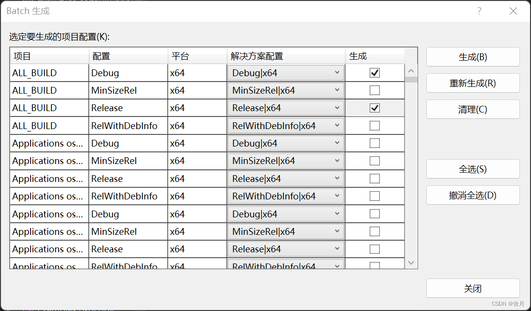 选择生成-->批生成,在弹出窗口选择ALL BUILD 的 Debug和Release: