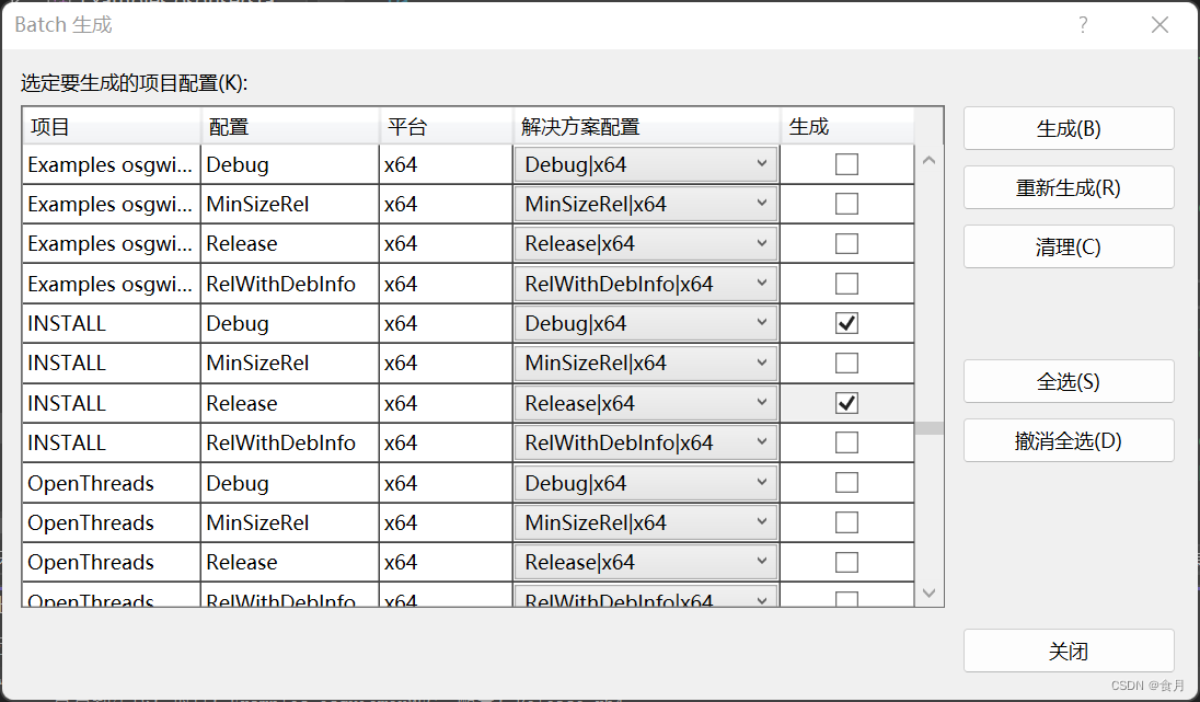 打开生成-->批生成,选择INSTALL的Debug和Rslease,点击“生成”