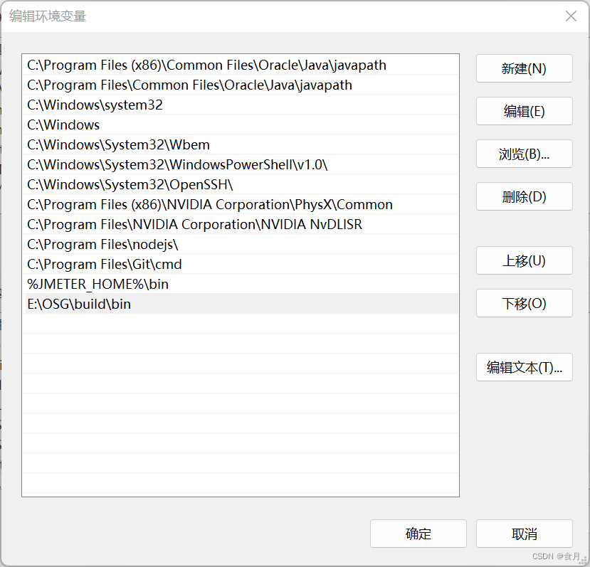 然后在Path变量中添加前面生成目录build目录中的bin目录(E:\OSG\build\bin)