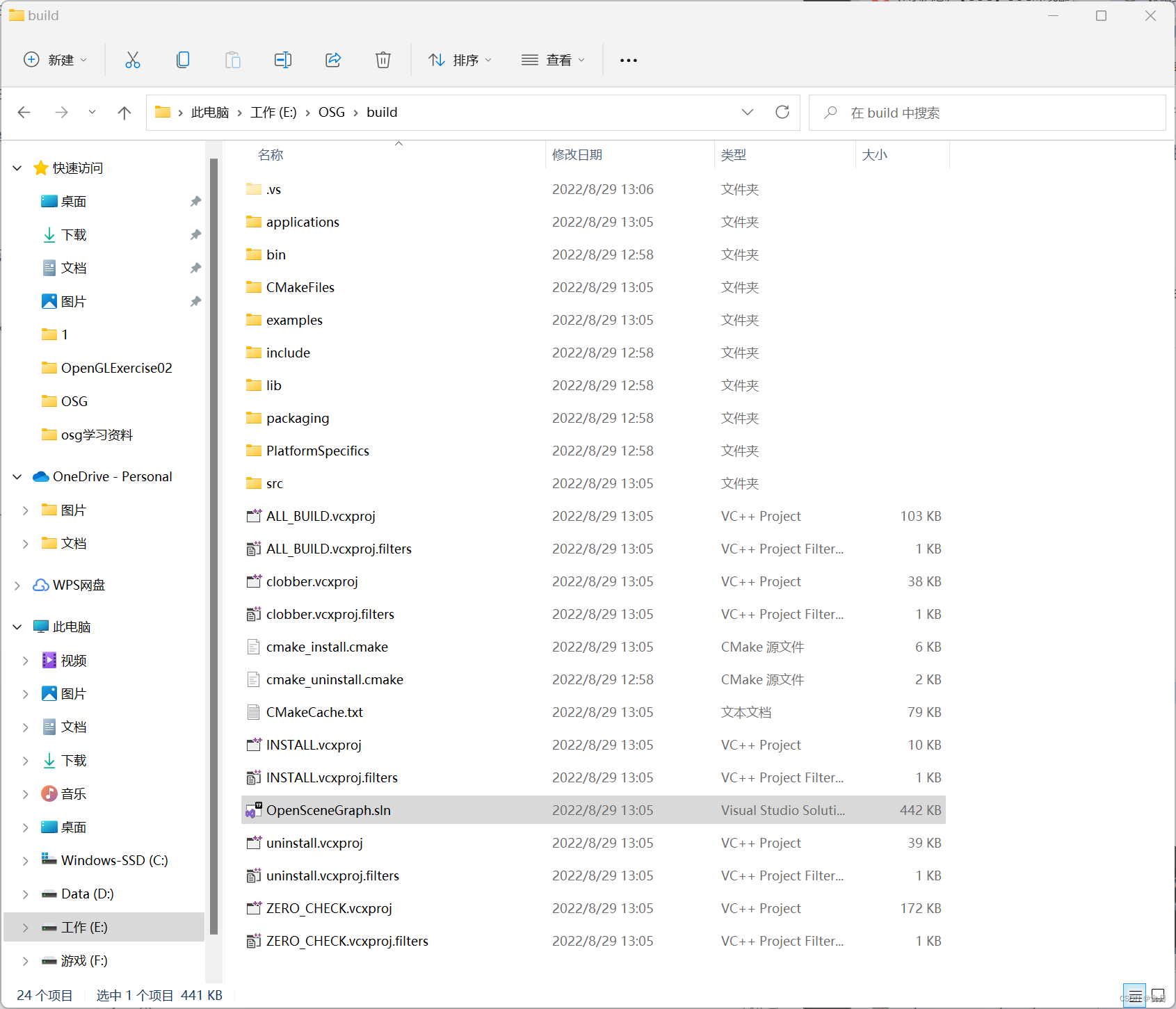 在build目录中,找到生成的OpenSceneGraph.sln文件,然后用VS2022打开: