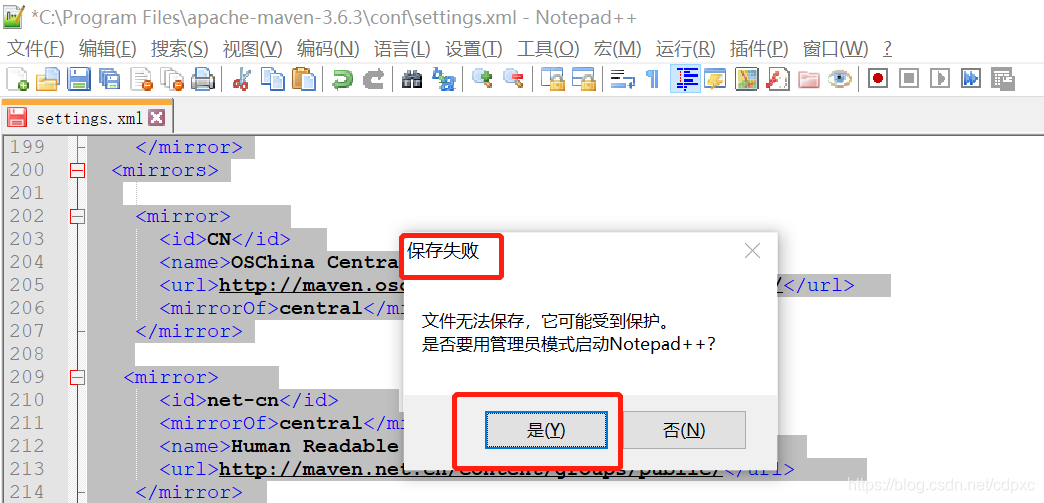 找到刚刚放置maven的位置,使用Notepad++打开子文件中conf内的settting.xml,我的为C:\Program Files\apache-maven-3.6.3\conf\settting.xml
