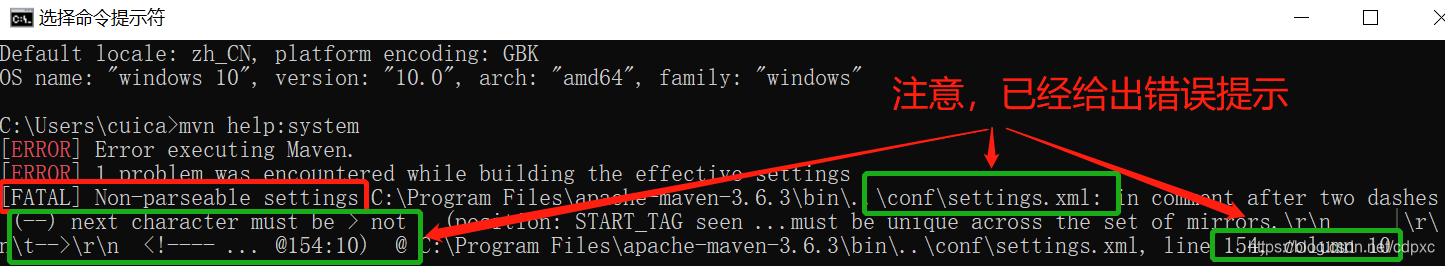 采用mvn help:system验证时,报错“[FATAL] Non-parseable settings ”,自习观察给出的错误提示,是安装在 C:\Program Files\apache-maven-3.6.3的文件夹中的子文件conf内的settting.xml报错,这不正是前面所说的配置修改的文件吗?