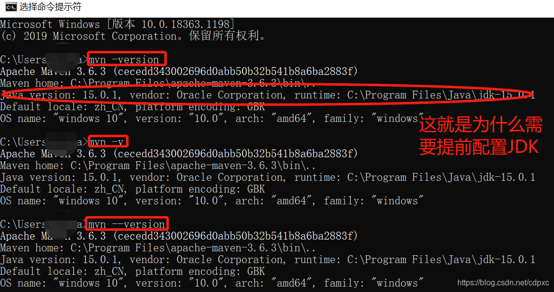 输入mvn -version 或者 mvn --version 或者 mvn -v (与JDK不同),均可,出现Maven主路径及JDK的相关信息,即正确,如下图。