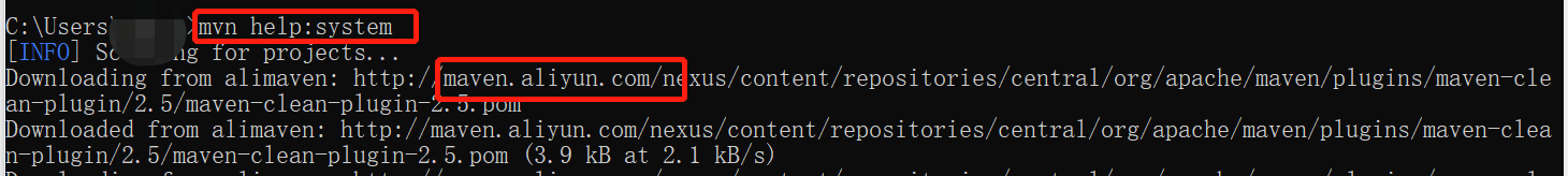 在命令提示符中输入,mvn help:system,出现很长的关于阿里云镜像的信息,最终显示”BUILD SUCCESS“, 即配置成功。
