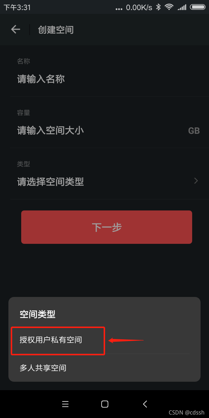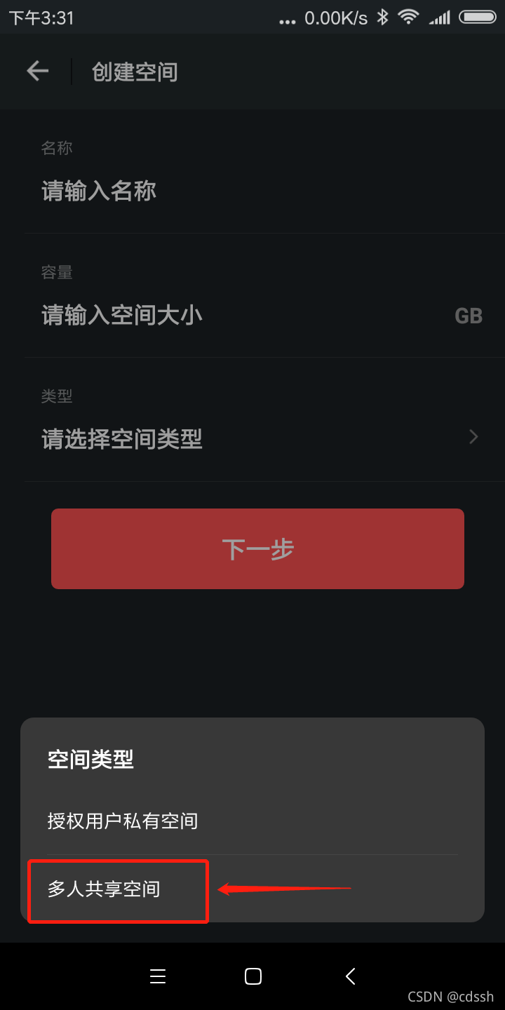 分配磁盘空间可以在设备管理中点击“创建空间”来进行,可以创建“授权用户私有空间”和“多人共享空间”。