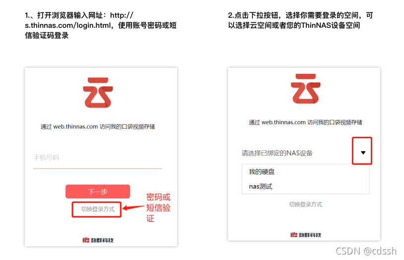 输入用户名以及密码(或短信验证码)登录,登录时候需要选择你要登录的空间,可以选择云空间也可以选择设备空间(web端登录空间的切换不太方便,选择一个登录之后就不能实时切换,要不退出重新登,要么你重新开一个窗口同样用账户密码登另外一个空间)