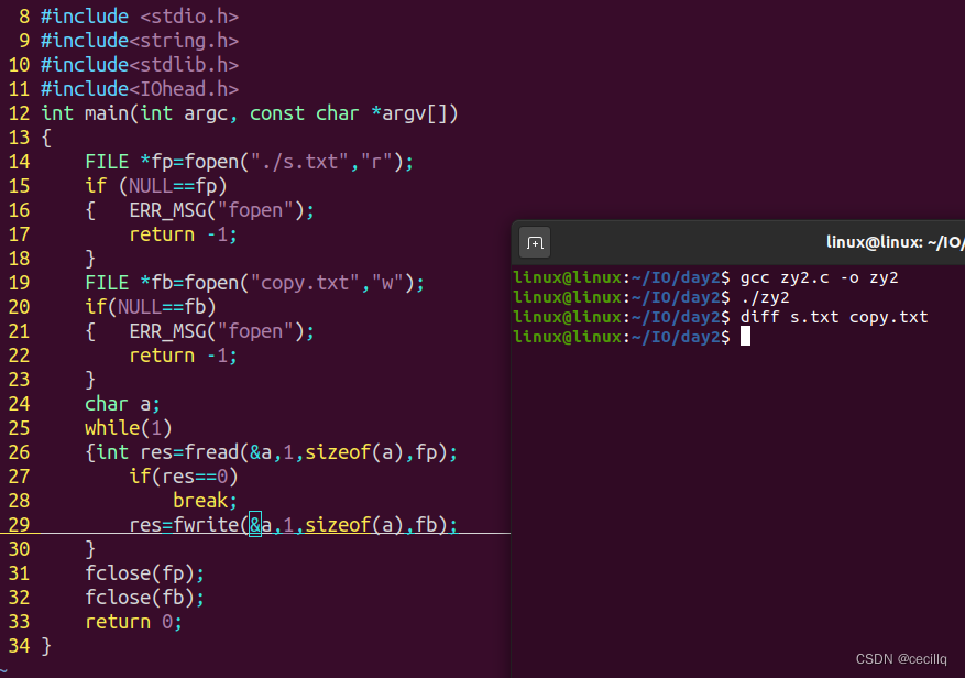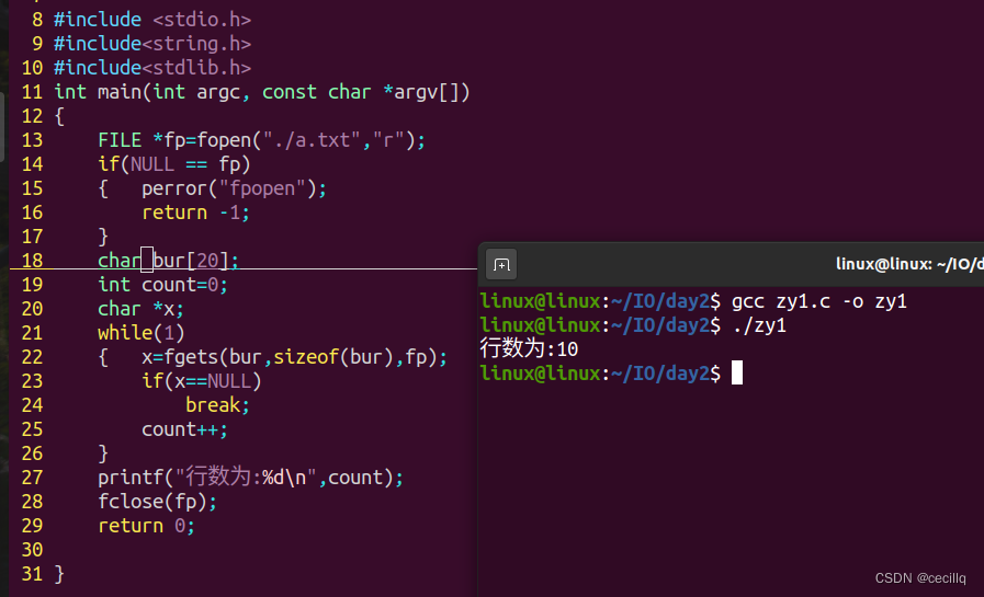 该文展示了两个C语言程序,第一个使用fgets函数计算文本文件的行数,第二个利用fwrite和fread函数实现文件的复制。在行数统计程序中,通过读取每一行并累加计数器实现。文件复制程序则读取源文件的每个字节并写入目标文件。