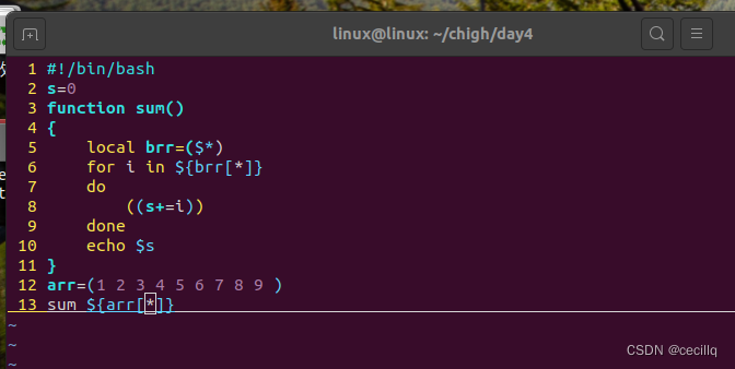 #!/bin/bash s=0 function sum() { local brr=($*) for i in ${brr[*]} do ((s+=i)) done echo $s } arr=(1 2 3 4 5 6 7 8 9 ) sum ${arr[*]}