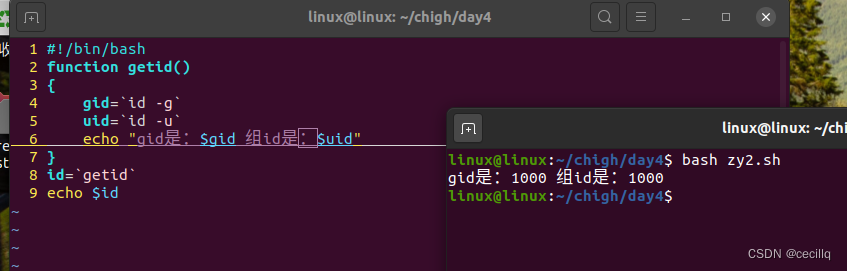 #!/bin/bash function getid() { gid=`id -g` uid=`id -u` echo "gid是:$gid 组id是:$uid" } id=`getid` echo $id