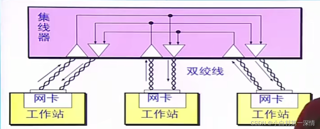 解释:工作站1发信号呼叫工作站2,集线器放大,工作站2发现呼叫自己,接受。