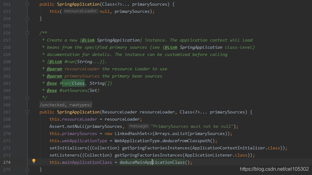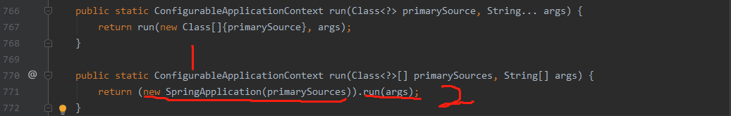 2.进入run方法,会发现传入的Object实例被包装到了一个Class数组,接着调用一个重载的静态run方法。由此,我们也发现,在启动时,我们可以传入一个Class数组,也就是调用接收数组的重载方法来启动多个实例。