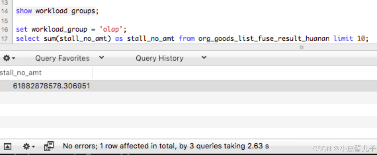 测试前的cpu在340%左右 mem 16%左右 ,sql 执行时长 118s 左右,期间执行其他workload olap 可以正常执行,但是执行sql 响应比全部要慢,执行统计sql