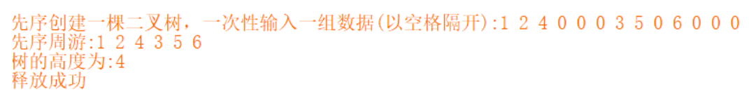 cout << "先序创建一棵二叉树,一次性输入一组数据(以空格隔开):";