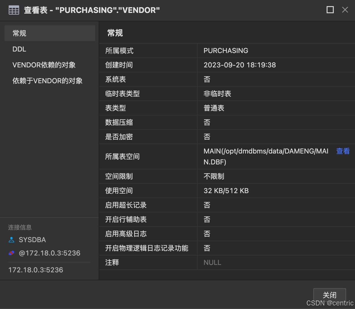 如果需要查看其他属性信息,右键单击表,选择 属性,可查看该表的详细信息和 DDL 语句。
