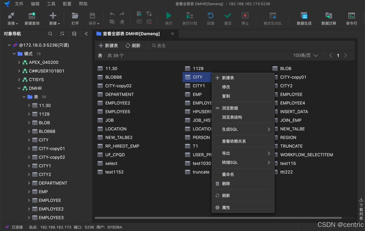 如果需要查看表中的数据,右键单击表,选择 浏览数据,可直接查看该表的数据信息,并可对表数据进行新增、删除、修改、复制、导入、导出等操作。