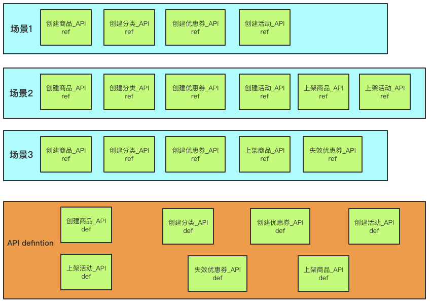 按照原始的模式,我们就需要些3个脚本文件分别来描述着3个场景,并且创建商品_API、创建分类_API、创建优惠券_API在场景1,2,3中均出现了;上架商品_API在场景2,3中均出现。由此我们完全可以预见到,当几百上千的用例场景出现后,这种形式是没有维护性可言的。