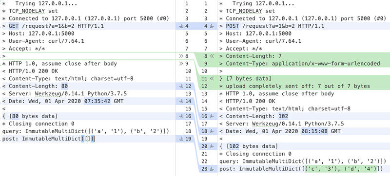 curl 'http://127.0.0.1:5000/request?' -d "a=1&b=2" -v -s &>post