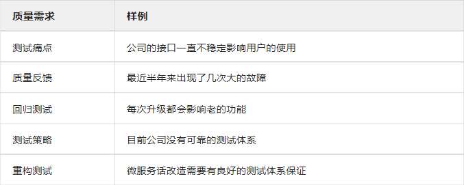 首先在做用例分析之前,可以通过追查公司一年来所有的故障原因,定位问题起因,或者通过与 CTO、产品经理、研发、运维、测试调查,得到质量痛点,还可以分析业务架构、流程调用,以及监控系统了解到业务的使用数据,从而得到质量需求。