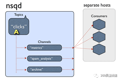 一个nsqd中可以创建多个队列(topic)。支持组播,一个队列可以有多个通道(channel)来同时消费,每个通道都将接收到这个队列中所有消息的副本,保证每个通道中消费到的消