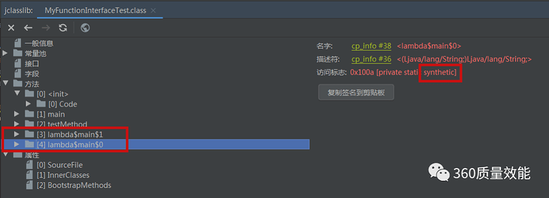 所以使用lambda表达式的地方,会在类编译的时候在本类中生成对应的私有静态方法和一个INNERCLASS的访问标识(具体是什么东西没找到资料,注释显示是一个访问标识),该访问标识会调用引导类加载器动态生成内部类,该内部类实现了函数式接口,在实现接口的方法中,会调用编译器生成静态方法,在使用lambda表达式的地方,通过传递内部类实例,来调用函数式接口方法。