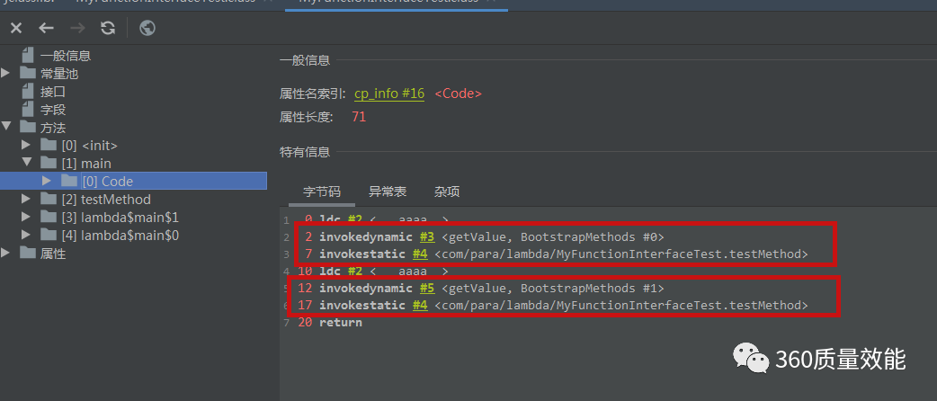 可以看到两个私有的静态方法干的就是Lambda表达式里面的内容,那么又是如何调用的生成的私有静态方法呢?如下图,通过分析main方法的L0,首先通过INVOKEDYNAMIC 指令调用是MyFunctionInterface的getValue方法的引用,以及后面的BootstrapMethods #0。使用jclasslib Bytecode viewer查看。