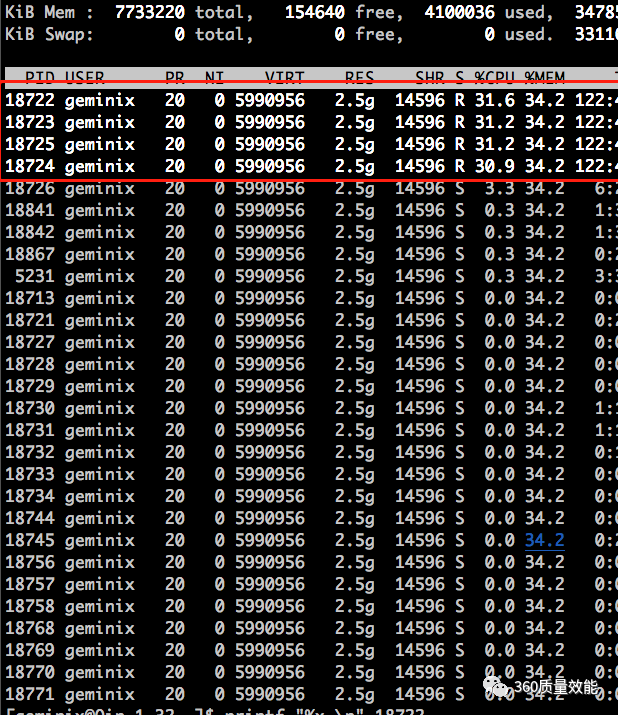 4.使用top -H -p 18713查看cpu占用率高的线程,存在4个