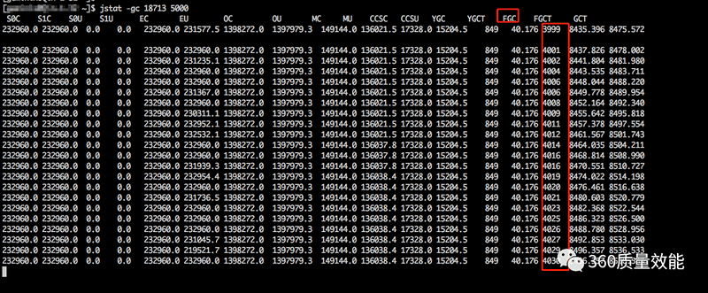 7.接着使用jstat -gc 18713 5000打印垃圾回收日志进行确认,发现jvm很短时间内进行了多次的fullgc操作