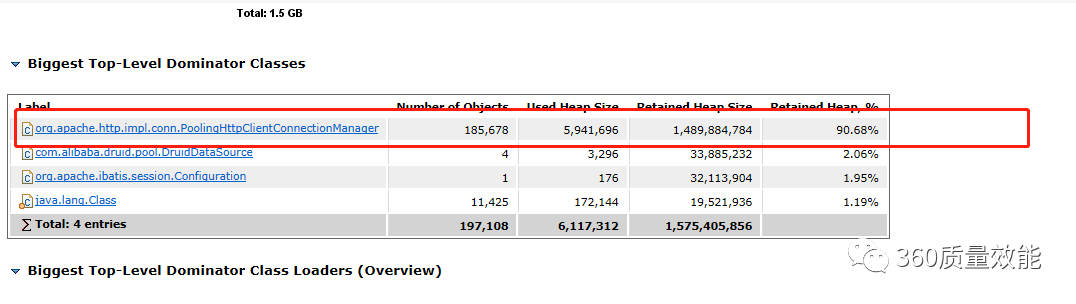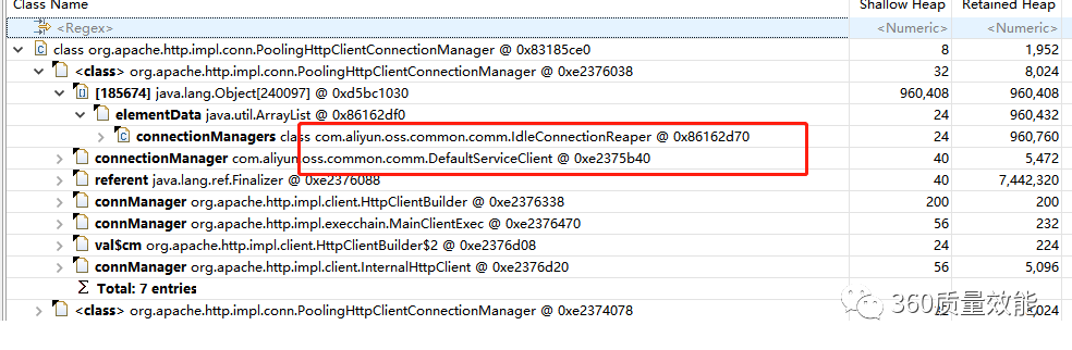 - 发现占用内存90%多的是http连接对象,点击查询引用明细,发现是oss依赖库引用了大量http连接对象