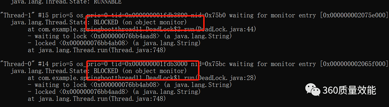 ● Jstack命令:主要是用来查看java线程的堆栈信息,分析线程有没有死锁,比如下面的这个两个线程互相等待对方释放锁而产生的死锁信息
