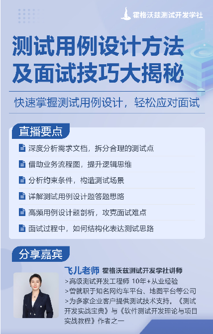 为了帮助大家更好地应对这些挑战,霍格沃兹测试开发学社为大家准备了【面试测试用例设计公开课】,希望能为你提供一些帮助。