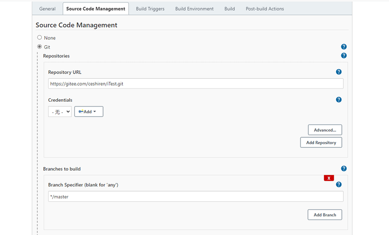 - 配置代码源,将被测项目代码的 git 地址配置到此处